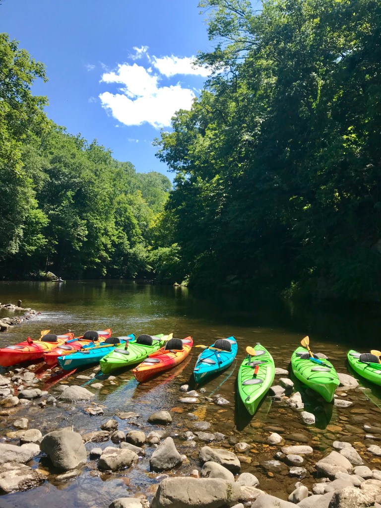 The Van Cortlandt Manor, home of The Great Jack O’ Lantern Blaze, is also on the Croton. You’ll see an inlet on your left, just west of Hwy 9, which you can paddle up to explore. As you continue upstream, an island separates the river but either direction around it is fine at high tide. Go left around it if the tide is low. You’ll see homes on the cliffs overhanging the river, a few docks, and a rope swing or two. Take out for lunch at the second big island where the river tumbles down through cold rocky streams on either side. This is the end of your journey and the reward is great. I love to walk the path up the island’s center, jumping over boulders, climbing trees and building dams. Sturdy river shoes or old sneakers are best. Head back the way you came, feeling like Huck Finn, and reward yourself with homemade ice cream at The Blue Pig at 121 Maple Street in Croton-on-Hudson.